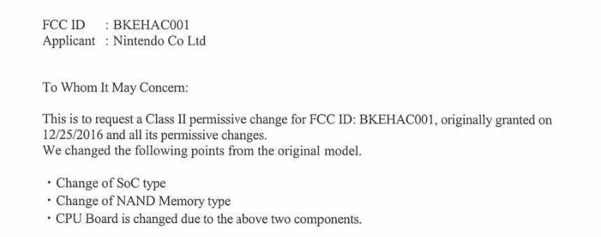Nintendo presentó algo que se llama un “Cambio de Permiso de Claso II” a la FCC; no es más que una solicitud para modificar un dispositivo existente sin tener que obtener la recertificación para su venta en los Estados Unidos. Ahí se mencionan los cambios.
