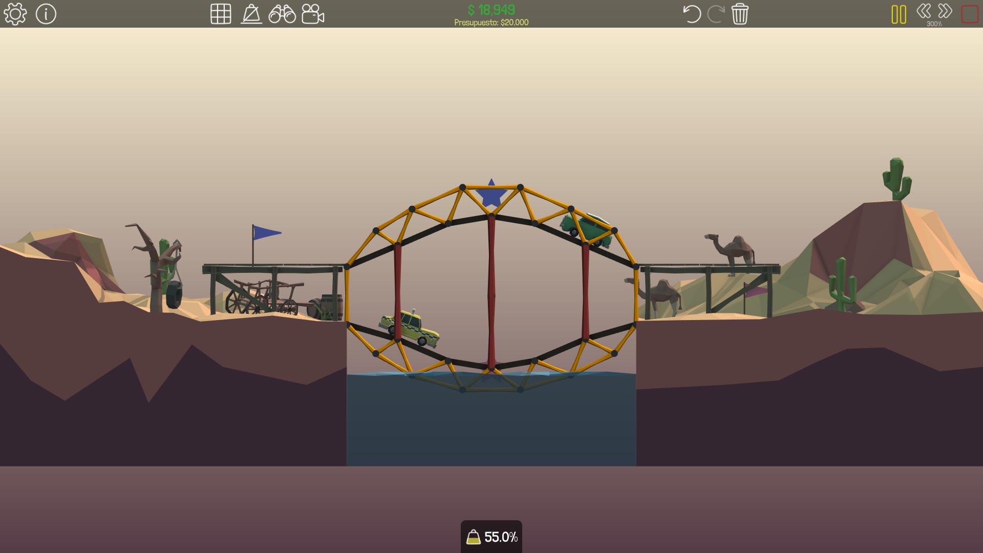 Jugar Poly Bridge es bastante simple, sólo debes construir un puente para que los vehículos en pantalla lo atraviesen, fácil ¿no? Los primeros niveles te servirán para familiarizarte con el modo de juego y con los principios básicos de construcción, como tomar en cuenta la tensión de tus construcciones, la resistencia que varía según el material que emplees y los casos en los que conviene más usar uno que otro. La dificultad de los niveles variará según el avance que tengas dentro de un “mundo” en concreto, porque Poly Bridge se divide en distintos mundos con 15 niveles cada uno. Dentro de cada uno de ellos habrá varios niveles que te causarán dolores de cabeza y te harán pensar como nunca, pero también habrá otros muy fáciles. Esto es algo genial ya que podrás tardar horas en un solo nivel, pero el siguiente podrá serte muy fácil de resolver. Si se te dificulta mucho, existe un tutorial bastante sencillo que te explicará de una manera bastante clara cómo construir y tomar en cuenta los diversos factores que pueden ser un obstáculo al momento de construir.