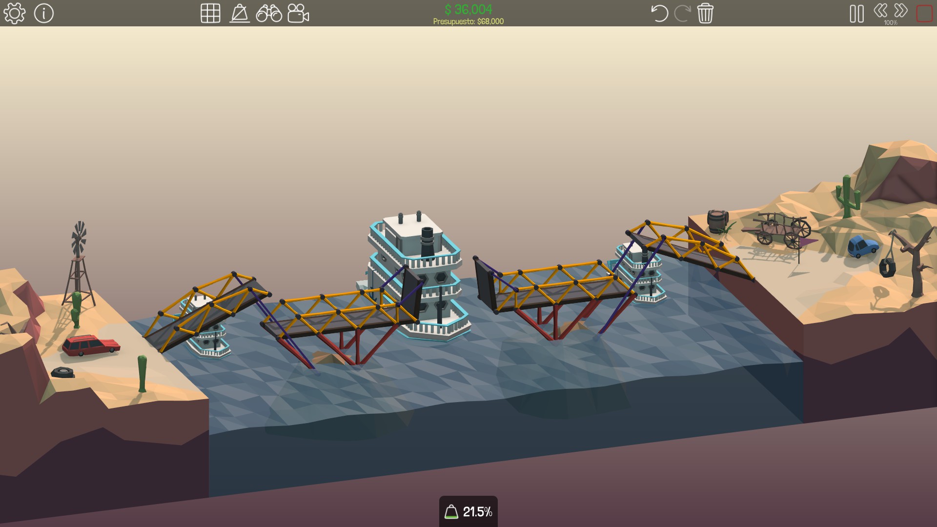 Como mencioné en el párrafo anterior, Poly Bridge divide sus niveles en distintos mundos. En total hay 7 mundos con 15 niveles cada uno, lo que nos da un gran total de 105 niveles dentro de todo el juego. Esto garantiza muchas horas de juego que dependerán de tu habilidad para pensar, pero también de tu lógica. El juego tiene 6 tipos diferentes de materiales para usar en la construcción de los puentes, en algunos niveles algunos tipos de material serán más convenientes de usar que otros, esto depende del o de los vehículos que tengan que avanzar por el puente, ya que como es lógico, cada tipo de vehículo tiene más o menos peso que otros. También habrá obstáculos que tengan que pasar, incluso habrá obstáculos que impedirán que construyas tu puente completamente recto, tendrás que ingeniártelas para crear un puente corredizo, colgante o hasta inclinado.