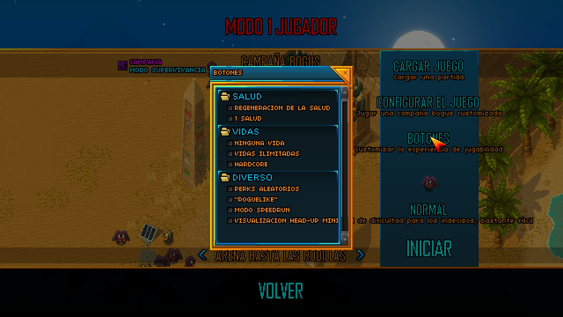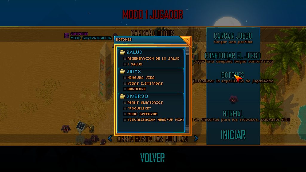 A primera vista, podría pasar como un juego sin pena, ni gloria pues carece de un gran intro o de menús sorprendentes. Nos encontraremos en primera instancia con la pantalla principal, en donde podremos configurar si queremos jugar el modo campaña o supervivencia, además de configurar la dificultad y otras opciones que pueden ayudarnos en el juego o aumentar más su dificultad. Pero cuando le “puchamos al play” todo cambia, nos enfrentamos a hordas tras hordas de enemigos que no se detendrán hasta acabarte o hasta que sus entrañas queden desparramadas en el suelo.