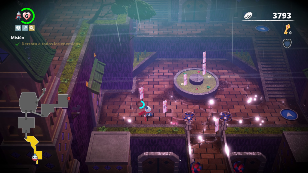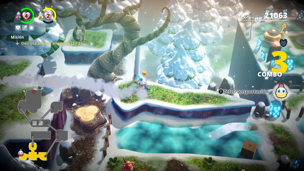 Dicho lo anterior, encontramos que lo básico resulta lanzar nieve a los enemigos y saltar, pero conforme avancemos en el juego se revelarán más mecánicas. Entre estas podremos pararnos sobre las bolas de nieve como en el clásico y también podremos patear las bolas en arcos hacia arriba y adelante aprovechando el 3D de los escenarios. Esto último es muy importante por que hay acertijos que se resuelven de esta manera.